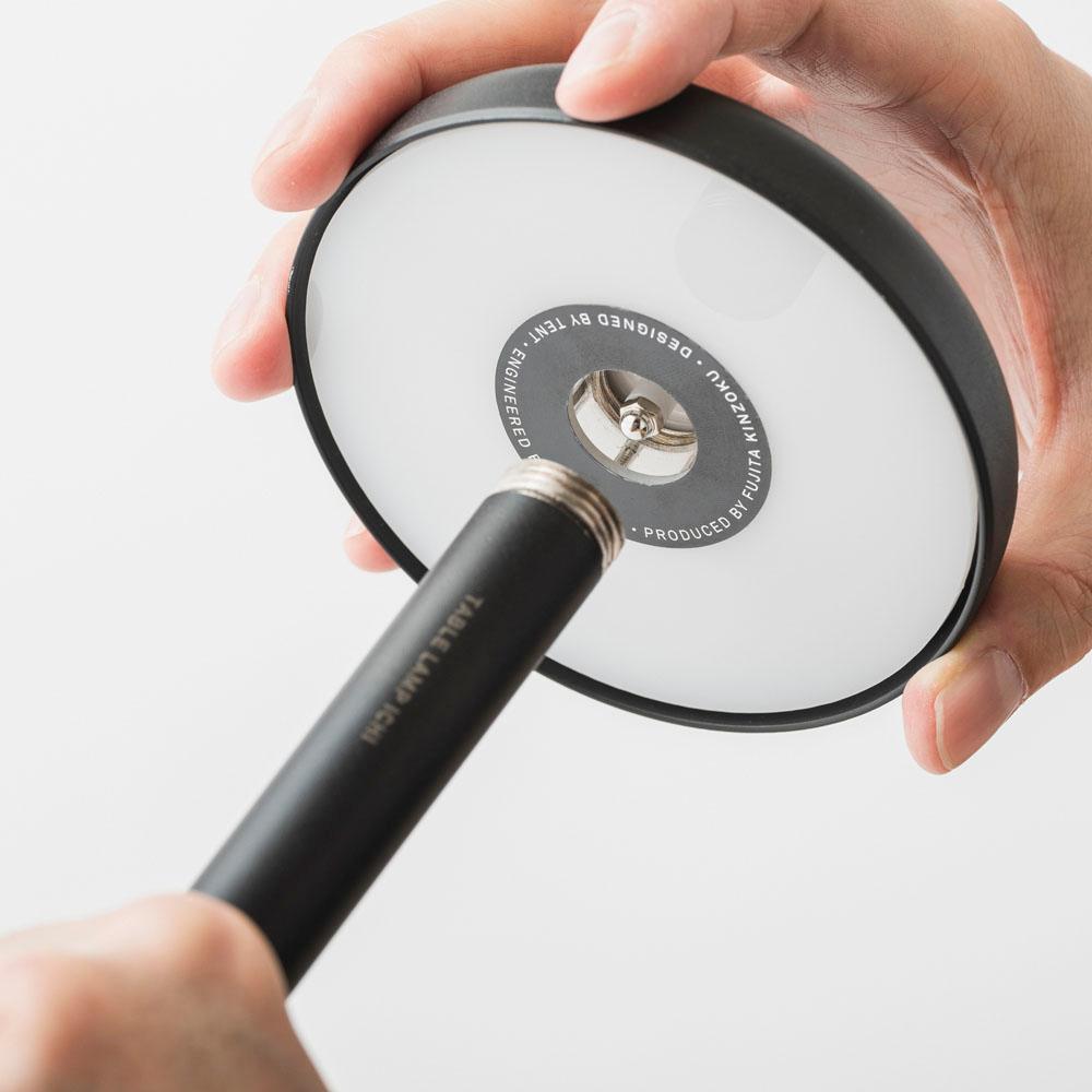 場所によって使い道も変えられるこのテーブルランプ イチの明るさの調整は、360度どこからでも、傘のフチをぐっと押し込むだけ。心地よい手応えのあるスイッチで。シチュエーションに合わせ、好みの明るさにできます。